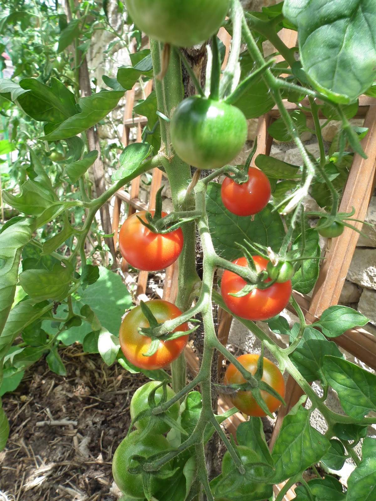 Alles is zo verschrikkelijk vroeg! niet alleen de tomaten natuurlijk, ik ben al volop uitgebloeide dahlia's aan het weghalen, de snackkomkommers die ik dit jaar voor het eerst gezaaid heb smaken ons ook prima, en de gewone zijn denk ik over een weekje rijp.De erwten, peulen en tuinbonen kan ik al op gaan ruimen.